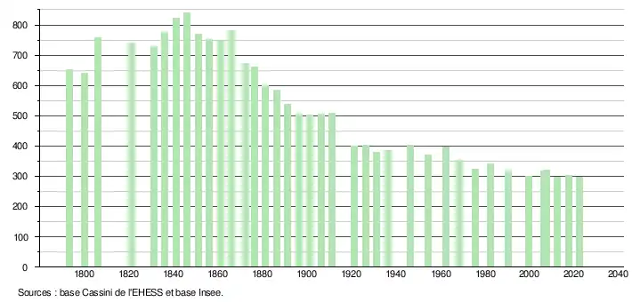 L'évolution du nombre d'habitants est connue à travers les recensements de la population effectués dans la commune depuis 1793. Pour les communes de moins de 10 000 habitants, une enquête de recensement portant sur toute la population est réalisée tous les cinq ans, les populations de référence des années intermédiaires étant quant à elles estimées par interpolation ou extrapolation[22]. Pour la commune, le premier recensement exhaustif entrant dans le cadre du nouveau dispositif a été réalisé en 2007[23].