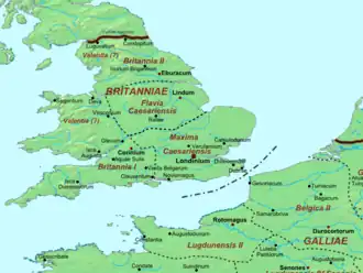 On trouve une énumération des provinces romaines du diocèse de Bretagne dans la liste de Vérone (vers 297 apr. J.-C.) et chez Rufius Festus (369 apr. J.-C.) : Britannia Prima (Bretagne Première), Britannia Secunda (Bretagne Seconde), Maxima Caesariensis et Flavia Caesariensis (Flavie césarienne)[1]. Le nom de Britannia Prima et l'emplacement de sa capitale sont attestées par une inscription retrouvée à Cirencester et datant probablement du règne de Julien[2].