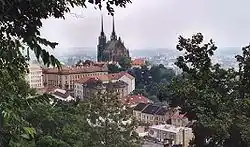 La cathédrale, construite à l'emplacement d'un ancien château fort, domine la colline de Petrov. Il s'agit d'un édifice de style gothique tardif du XIIIesiècle, construit sur une crypte plus ancienne, et remanié dans le style baroque en 1743-1746 après que les Suédois l'eurent incendié lors du siège de 1645. La façade et les tours ont été terminées au début du XXesiècle.
