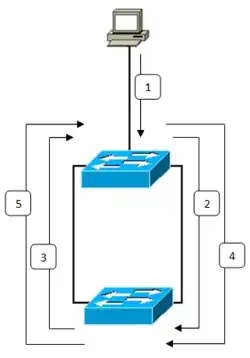- Étant donné que le paquet est diffusé, les commutateurs le répètent toujours sur tous les ports, à l’exception du port d’origine. Le cycle est donc destiné à se poursuivre indéfiniment.