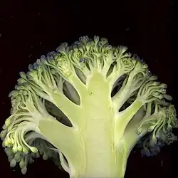 À fort grossissement et en effectuant une coupe, on peut observer les fleurs du brocoli qui selon leur position dans l'inflorescence sont en boutons ou parfois pratiquement écloses. C'est la couleur des pétales qui donne à la pomme de brocoli mûre sa couleur parfois jaune et parfois d'un beau bleu[4].