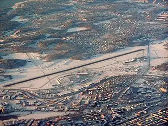 La quartier de Bromma kyrka vu du nord, avec l'aéroport de Stockholm-Bromma au premier plan