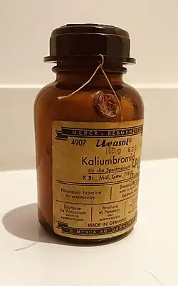 Le bromure de potassium est un sel de formule chimique KBr, composé des ions potassium et bromure. Il est de couleur blanche ou incolore.