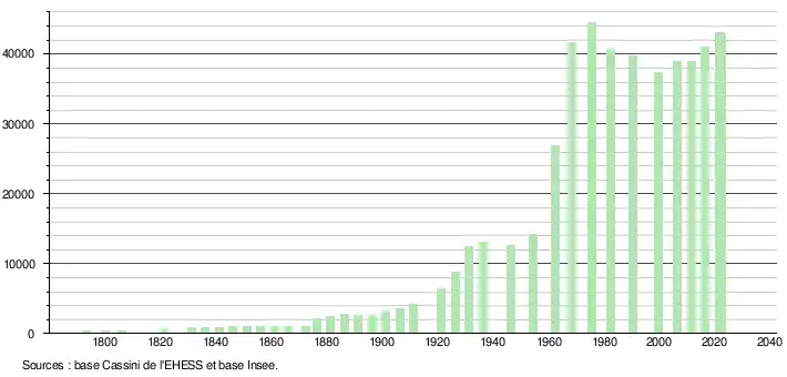 - ↑ Par convention dans Wikipédia, le principe a été retenu de n’afficher dans le tableau des recensements et le graphique, pour les populations de référence postérieures à 1999, que les populations correspondant à une enquête exhaustive de recensement pour les communes de moins de 10 000 habitants, et que les populations des années 2006, 2011, 2016, etc. pour les communes de plus de 10 000 habitants, ainsi que la dernière population de référence publiée par l’Insee pour l'ensemble des communes.