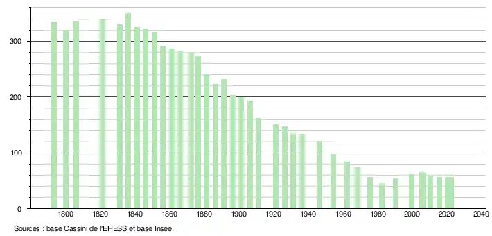 L'évolution du nombre d'habitants est connue à travers les recensements de la population effectués dans la commune depuis 1793. Pour les communes de moins de 10 000 habitants, une enquête de recensement portant sur toute la population est réalisée tous les cinq ans, les populations de référence des années intermédiaires étant quant à elles estimées par interpolation ou extrapolation[19]. Pour la commune, le premier recensement exhaustif entrant dans le cadre du nouveau dispositif a été réalisé en 2005[20].