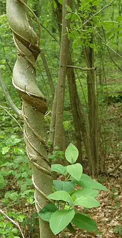 « J’ai observé une tumeur qui s’élevait en spirale autour d’un coudrier âgé de neuf ans. Cette tumeur avait été causée par un chèvrefeuille qui s’était étendu aussi en spirale autour du coudrier, dans le temps où cet arbre n’avait que quatre ans. Le chèvrefeuille et le coudrier ainsi unis l’un à l’autre, ayant pris de l’accroissement pendant cinq ans, il s’éleva sur le coudrier une tumeur qui s’étendait en spirale au-dessus du chèvrefeuille, et qui suivait les contours de ce ligament. La tumeur venait de ce que le cours de la sève descendante du coudrier avait été arrêté dans les endroits où il était serré par le chèvrefeuille, dont la sève avait aussi été supprimée par le contact du coudrier ; car cet arbre n’avait que quatre couches annuelles aux endroits du contact, comme elles y étaient lorsque le chèvrefeuille s’y était joint, et le chèvrefeuille n’avait qu’une couche annuelle aux endroits qui s’étaient appliqués contre le coudrier lorsqu’il l’avait entouré. »