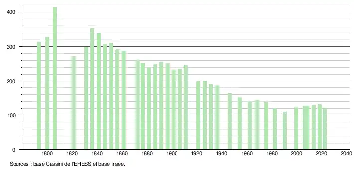 L'évolution du nombre d'habitants est connue à travers les recensements de la population effectués dans la commune depuis 1793. Pour les communes de moins de 10 000 habitants, une enquête de recensement portant sur toute la population est réalisée tous les cinq ans, les populations de référence des années intermédiaires étant quant à elles estimées par interpolation ou extrapolation[19]. Pour la commune, le premier recensement exhaustif entrant dans le cadre du nouveau dispositif a été réalisé en 2008[20].