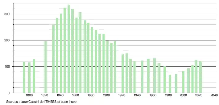 L'évolution du nombre d'habitants est connue à travers les recensements de la population effectués dans la commune depuis 1793. Pour les communes de moins de 10 000 habitants, une enquête de recensement portant sur toute la population est réalisée tous les cinq ans, les populations de référence des années intermédiaires étant quant à elles estimées par interpolation ou extrapolation[27]. Pour la commune, le premier recensement exhaustif entrant dans le cadre du nouveau dispositif a été réalisé en 2006[28].