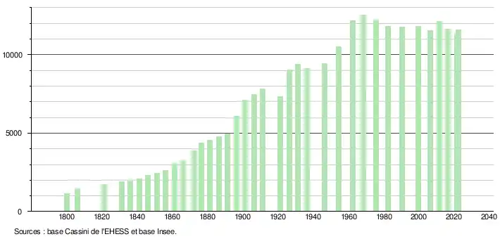 - ↑ Par convention dans Wikipédia, le principe a été retenu de n’afficher dans le tableau des recensements et le graphique, pour les populations de référence postérieures à 1999, que les populations correspondant à une enquête exhaustive de recensement pour les communes de moins de 10 000 habitants, et que les populations des années 2006, 2011, 2016, etc. pour les communes de plus de 10 000 habitants, ainsi que la dernière population de référence publiée par l’Insee pour l'ensemble des communes.