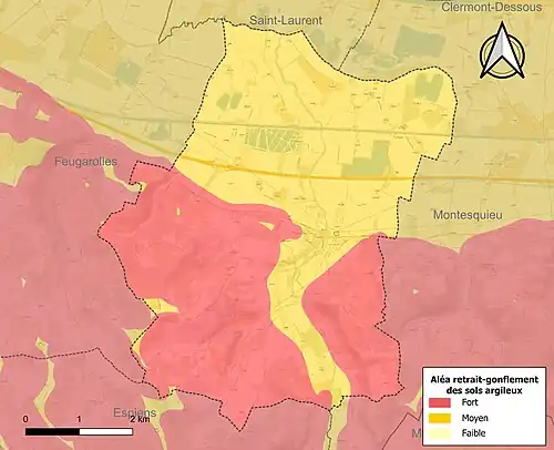 Le retrait-gonflement des sols argileux est susceptible d'engendrer des dommages importants aux bâtiments en cas d’alternance de périodes de sécheresse et de pluie[18]. La totalité de la commune est en aléa moyen ou fort (91,8 % au niveau départemental et 48,5 % au niveau national)[Carte 2]. Depuis le , en application de la loi ELAN, différentes contraintes s'imposent aux vendeurs, maîtres d'ouvrages ou constructeurs de biens situés dans une zone classée en aléa moyen ou fort[Note 6],[19].