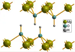 La brucite est le corps chimique minéral naturel composé ionique des cations magnésium Mg2+ et des anions hydroxyles OH−, soit l'hydroxyde de magnésium de formule chimique Mg(OH)2.