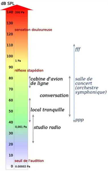 - ↑ Les articles R4431-1 et 2 prévoient que le « 1°. Valeurs limites d'exposition : Niveau d'exposition quotidienne [huit heures] au bruit de 87 dB (A) ou niveau de pression acoustique de crête de 140 dB (C) ; 2° Valeurs d'exposition supérieures déclenchant l'action de prévention prévue à l'article R. 4434-3 [signalisation appropriée], au 2° de l'article R. 4434-7 [usage de protections individuelles sous la responsabilité de l'employeur], et à l'article R. 4435-1 [surveillance médicale renforcée] : Niveau d'exposition quotidienne au bruit de 85 dB (A) ou niveau de pression acoustique de crête de 137 dB (C) ; 3° Valeurs d'exposition inférieures déclenchant l'action de prévention prévue au 1° de l'article R. 4434-7 [mise à disposition de protections individuelles] et aux articles R. 4435-2 [examen audiométrique préventif] et R. 4436-1 [information des travailleurs] : Niveau d'exposition quotidienne au bruit de 80 dB (A) ou niveau de pression acoustique de crête de 135 dB (C). »