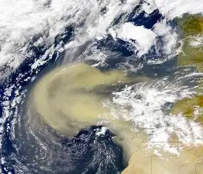Exemple d'un nuage de sable formé au-dessus de la mer Rouge (ici en 2005), source de brume de sable.