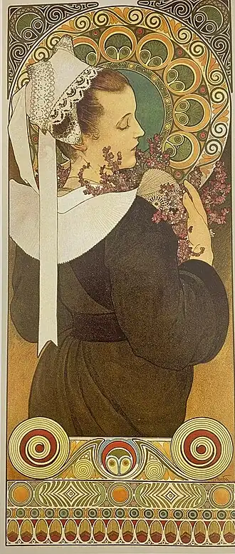 La femme prend place dans un cadre ornementé. Les motifs témoignent de l'inspiration bretonne de Mucha, notamment la reprise de formes issues de la broderie traditionnelle de Cornouaille. Ainsi, le registre supérieur prend la forme de cercles concentriques autour du visage de la femme. Ces cercles comprennent entre autres le motif des plumes de paon, dit pleon pavenn. Les angles supérieurs reprennent également ces mêmes motifs. Le registre inférieur reprend la superposition de bandeaux figurés caractéristiques des broderies bigoudènes. Les premières lignes, représentant une suite de petits cercles, illustrent le motif de la « chaîne de vie ». Sur la ligne du dessus, l'on reconnaît le motif de la fougère, ou boud-radenn. Enfin, le registre supérieur du bandeau représente une plume de paon encadrée par deux cercles concentriques, équivalent de « soleil breton »[1].