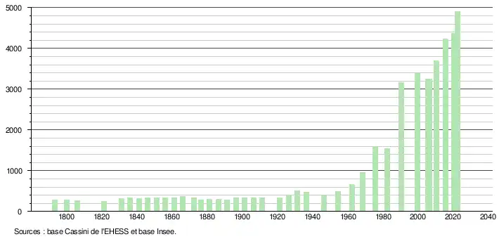 L'évolution du nombre d'habitants est connue à travers les recensements de la population effectués dans la commune depuis 1793. Pour les communes de moins de 10 000 habitants, une enquête de recensement portant sur toute la population est réalisée tous les cinq ans, les populations de référence des années intermédiaires étant quant à elles estimées par interpolation ou extrapolation[33]. Pour la commune, le premier recensement exhaustif entrant dans le cadre du nouveau dispositif a été réalisé en 2005[34].