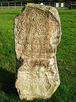 Au-delà de la paroi arrière de la chambre, dans un endroit qui aurait été à l'intérieur de la butte, se trouve une réplique de la « pierre au motif ». Elle a été trouvée enterrée sous le monticule et remise debout dans ce que l'on pense avoir été son emplacement d'origine à une époque où le site était un henge plutôt qu'un tombeau. Les modèles prennent la forme de sinueux de la serpentine formes qui s'enroulent autour des deux côtés de la pierre. À l'intérieur de la tombe de pierre a un petit motif de spirale ébréchée, bien que son authenticité a été mise en doute[6].