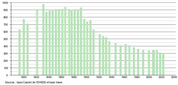 L'évolution du nombre d'habitants est connue à travers les recensements de la population effectués dans la commune depuis 1793. Pour les communes de moins de 10 000 habitants, une enquête de recensement portant sur toute la population est réalisée tous les cinq ans, les populations de référence des années intermédiaires étant quant à elles estimées par interpolation ou extrapolation[21]. Pour la commune, le premier recensement exhaustif entrant dans le cadre du nouveau dispositif a été réalisé en 2007[22].