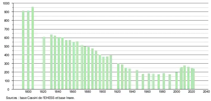 L'évolution du nombre d'habitants est connue à travers les recensements de la population effectués dans la commune depuis 1793. Pour les communes de moins de 10 000 habitants, une enquête de recensement portant sur toute la population est réalisée tous les cinq ans, les populations de référence des années intermédiaires étant quant à elles estimées par interpolation ou extrapolation[21]. Pour la commune, le premier recensement exhaustif entrant dans le cadre du nouveau dispositif a été réalisé en 2005[22].