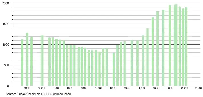 L'évolution du nombre d'habitants est connue à travers les recensements de la population effectués dans la commune depuis 1793. Pour les communes de moins de 10 000 habitants, une enquête de recensement portant sur toute la population est réalisée tous les cinq ans, les populations de référence des années intermédiaires étant quant à elles estimées par interpolation ou extrapolation[24]. Pour la commune, le premier recensement exhaustif entrant dans le cadre du nouveau dispositif a été réalisé en 2008[25].