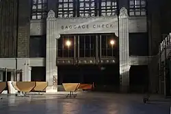 La décoration est du style XVIIe siècle. Le hall principal fait 69 m de long, 21 m de large et 17,8 m de hauteur (19,4 m aux extrémités en forme de dôme). Le bâtiment comprenait différents espaces à louer, un restaurant, un café, un bureau de télégraphe de la Western Union et une fontaine à soda, soit toutes les commodités d'une gare standard. Curtiss Street est directement en dessous du hall, mais a été fermée depuis la fin des années 1980 pour des raisons de sécurité.