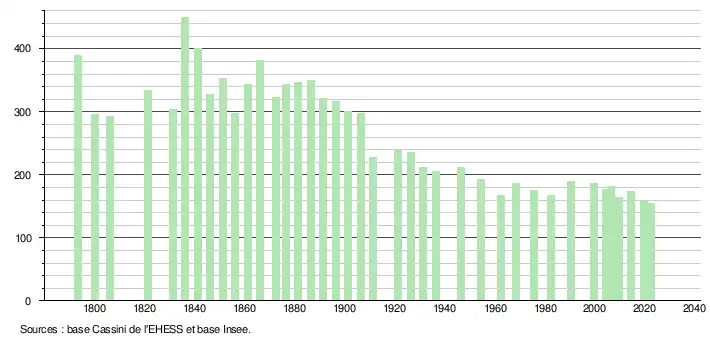 L'évolution du nombre d'habitants est connue à travers les recensements de la population effectués dans la commune depuis 1793. Pour les communes de moins de 10 000 habitants, une enquête de recensement portant sur toute la population est réalisée tous les cinq ans, les populations de référence des années intermédiaires étant quant à elles estimées par interpolation ou extrapolation[12]. Pour la commune, le premier recensement exhaustif entrant dans le cadre du nouveau dispositif a été réalisé en 2004[13].
