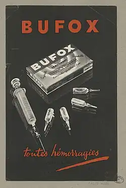 - ↑ Un buvard publicitaire très évocateur : « Bufox, hémostatique »; Cécile Raynal 2010