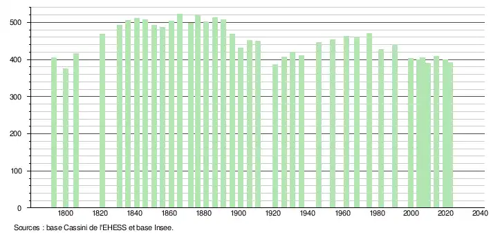 L'évolution du nombre d'habitants est connue à travers les recensements de la population effectués dans la commune depuis 1793. Pour les communes de moins de 10 000 habitants, une enquête de recensement portant sur toute la population est réalisée tous les cinq ans, les populations de référence des années intermédiaires étant quant à elles estimées par interpolation ou extrapolation[25]. Pour la commune, le premier recensement exhaustif entrant dans le cadre du nouveau dispositif a été réalisé en 2004[26].