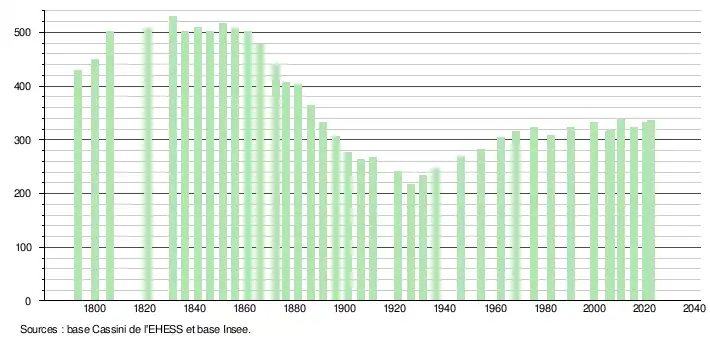 L'évolution du nombre d'habitants est connue à travers les recensements de la population effectués dans la commune depuis 1793. Pour les communes de moins de 10 000 habitants, une enquête de recensement portant sur toute la population est réalisée tous les cinq ans, les populations de référence des années intermédiaires étant quant à elles estimées par interpolation ou extrapolation[24]. Pour la commune, le premier recensement exhaustif entrant dans le cadre du nouveau dispositif a été réalisé en 2005[25].