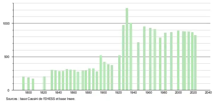 L'évolution du nombre d'habitants est connue à travers les recensements de la population effectués dans la commune depuis 1793. Pour les communes de moins de 10 000 habitants, une enquête de recensement portant sur toute la population est réalisée tous les cinq ans, les populations de référence des années intermédiaires étant quant à elles estimées par interpolation ou extrapolation[21]. Pour la commune, le premier recensement exhaustif entrant dans le cadre du nouveau dispositif a été réalisé en 2008[22].