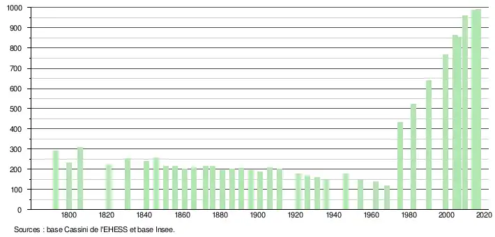 L'évolution du nombre d'habitants est connue à travers les recensements de la population effectués dans la commune depuis 1793. Pour les communes de moins de 10 000 habitants, une enquête de recensement portant sur toute la population est réalisée tous les cinq ans, les populations de référence des années intermédiaires étant quant à elles estimées par interpolation ou extrapolation[7]. Pour la commune, le premier recensement exhaustif entrant dans le cadre du nouveau dispositif a été réalisé en 2004[8].