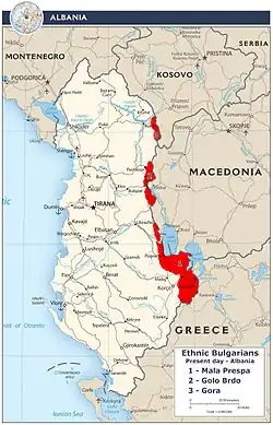 Les régions d'Albanie ayant une population bulgare compacte sont Mala Prespa, Gollobordë (en) et Gora, situés le long de la frontière avec la Macédoine du Nord. Un nombre important de Bulgares issus de l'exode rural vivent également dans les villes d'Elbasan (4000 à 12 000), Tirana (3000 à 4000), Durrës (2000 à 3000) et Peshkopia (environ 1000 personnes)[6].