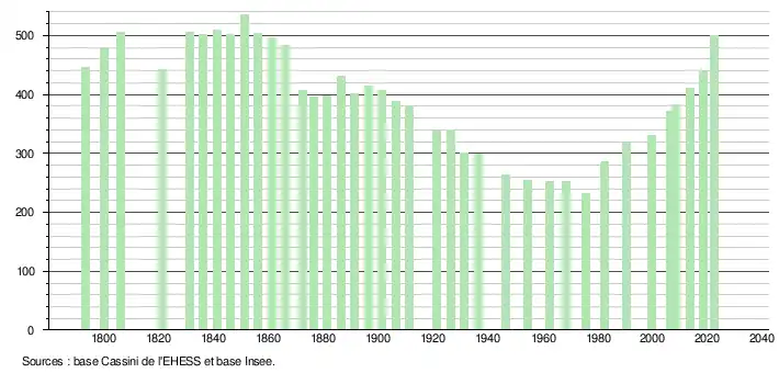 L'évolution du nombre d'habitants est connue à travers les recensements de la population effectués dans la commune depuis 1793. Pour les communes de moins de 10 000 habitants, une enquête de recensement portant sur toute la population est réalisée tous les cinq ans, les populations de référence des années intermédiaires étant quant à elles estimées par interpolation ou extrapolation[19]. Pour la commune, le premier recensement exhaustif entrant dans le cadre du nouveau dispositif a été réalisé en 2008[20].