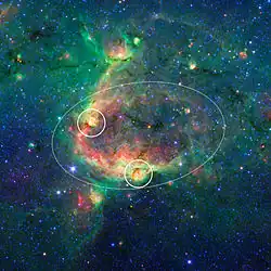 Bulle multiple : Photographie en infrarouges prise par le télescope spatial Spitzer. Elle présente une structure de bulle multiple, on voit une bulle géante et deux plus petites bulles qui ont été formées par des vents solaires.