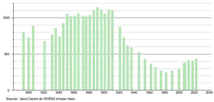 L'évolution du nombre d'habitants est connue à travers les recensements de la population effectués dans la commune depuis 1793. Pour les communes de moins de 10 000 habitants, une enquête de recensement portant sur toute la population est réalisée tous les cinq ans, les populations de référence des années intermédiaires étant quant à elles estimées par interpolation ou extrapolation[15]. Pour la commune, le premier recensement exhaustif entrant dans le cadre du nouveau dispositif a été réalisé en 2007[16].