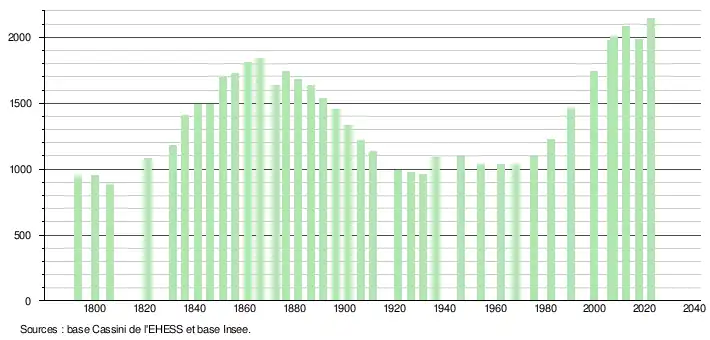 L'évolution du nombre d'habitants est connue à travers les recensements de la population effectués dans la commune depuis 1793. Pour les communes de moins de 10 000 habitants, une enquête de recensement portant sur toute la population est réalisée tous les cinq ans, les populations de référence des années intermédiaires étant quant à elles estimées par interpolation ou extrapolation[20]. Pour la commune, le premier recensement exhaustif entrant dans le cadre du nouveau dispositif a été réalisé en 2007[21].