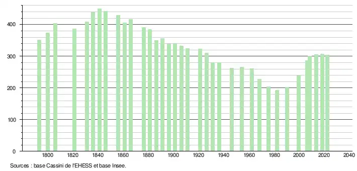 L'évolution du nombre d'habitants est connue à travers les recensements de la population effectués dans la commune depuis 1793. Pour les communes de moins de 10 000 habitants, une enquête de recensement portant sur toute la population est réalisée tous les cinq ans, les populations de référence des années intermédiaires étant quant à elles estimées par interpolation ou extrapolation[30]. Pour la commune, le premier recensement exhaustif entrant dans le cadre du nouveau dispositif a été réalisé en 2008[31].