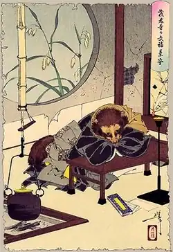 L'image d'un tanuki sortant une tête, des pattes, et tenant un parapluie tout en marchant sur une corde est devenue très répandue et souvent représentée de manière humoristique[19].