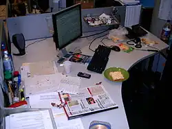 - À partir de 1980, la micro-informatique et l’arrivée de l’ordinateur personnel, la configuration du bureau a évolué vers un espace de travail un peu plus spacieux ou mieux organisé pour permettre l’agencement du matériel. Si l’écran a sa place sur la table du bureau avec le téléphone, le clavier se loge sous celle-ci sur un étroit tiroir amovible, l’unité centrale est logée, sous ou à côté du bureau (en fonction du format du boîtier), dans le caisson sur lequel est également posée l’imprimante.