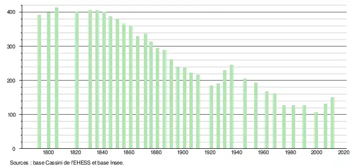 - ↑ Dans le tableau des recensements et le graphique, par convention dans Wikipédia, le principe a été retenu, pour les populations légales postérieures à 1999 de n’afficher dans le tableau des recensements et le graphique que les populations correspondant à l'année 2006, première population légale publiée calculée conformément aux concepts définis dans le décret no 2003-485 du 5 juin 2003, et les années correspondant à une enquête exhaustive de recensement pour les communes de moins de 10 000 habitants, ainsi que la dernière population légale publiée par l’Insee.