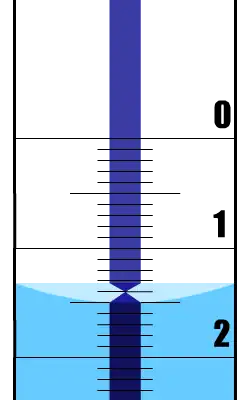 La lecture de la graduation se fait généralement en bas du ménisque, sauf pour des composés très colorés, comme les solutions de permanganate de potassium. La lecture est alors en haut du ménisque. Certaines burette sont munies d'une barre bleue à l'arrière de la graduation; Le ménisque crée, par effet d'optique, une pointe qui permet de lire précisément la valeur du volume. Dans ce cas, cette technique de lecture doit être utilisée à la fois pour ajuster le zéro et pour lire les volumes.