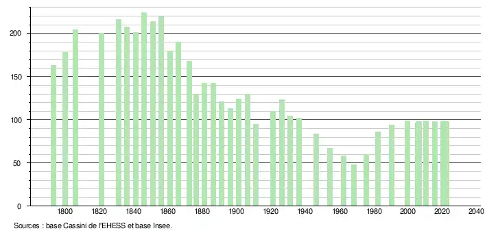 L'évolution du nombre d'habitants est connue à travers les recensements de la population effectués dans la commune depuis 1793. Pour les communes de moins de 10 000 habitants, une enquête de recensement portant sur toute la population est réalisée tous les cinq ans, les populations de référence des années intermédiaires étant quant à elles estimées par interpolation ou extrapolation[35]. Pour la commune, le premier recensement exhaustif entrant dans le cadre du nouveau dispositif a été réalisé en 2005[36].