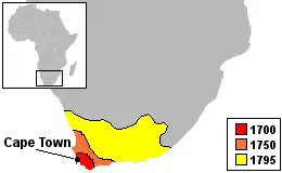 Les implantations des Trekboers, sur des terres prises aux autochtones Khoïsan, sont intégrées à la colonie du Cap et dotées d'une administration qui restera l'ossature de l'organisation urbaine d'Afrique du Sud pendant longtemps[23] : un landdrost administre le district, assisté de plusieurs (quatre à huit) heemraden (« citoyens conseillers »)[24],[25] et d'un veldkornet, responsable de la milice locale, nommée kommando[26].