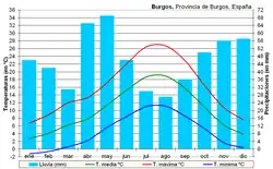 Burgos a un climat méditerranéen continental. La saison la plus pluvieuse est le printemps ; l'été est plus doux et plus humide que dans l'Espagne méditerranéenne. Les hivers sont froids, avec des températures minimales qui descendent parfois jusqu'à -10 °C.