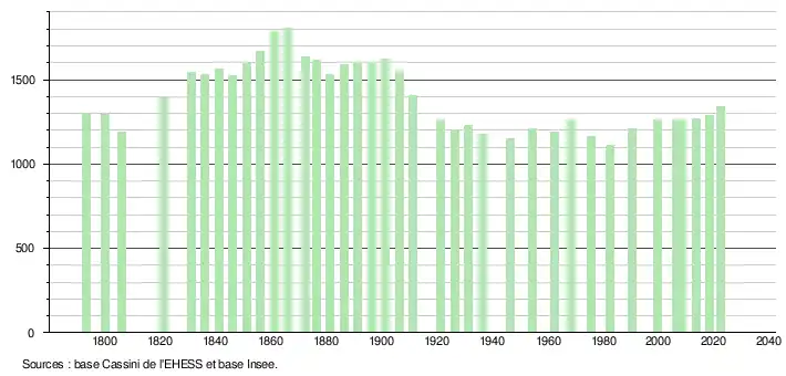 L'évolution du nombre d'habitants est connue à travers les recensements de la population effectués dans la commune depuis 1793. Pour les communes de moins de 10 000 habitants, une enquête de recensement portant sur toute la population est réalisée tous les cinq ans, les populations de référence des années intermédiaires étant quant à elles estimées par interpolation ou extrapolation[17]. Pour la commune, le premier recensement exhaustif entrant dans le cadre du nouveau dispositif a été réalisé en 2008[18].