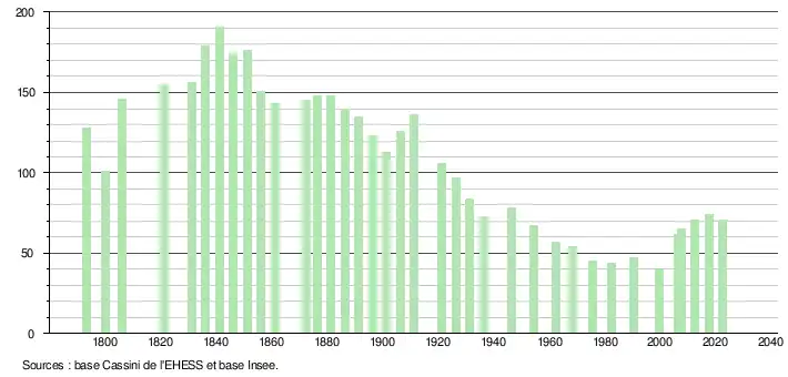 L'évolution du nombre d'habitants est connue à travers les recensements de la population effectués dans la commune depuis 1793. Pour les communes de moins de 10 000 habitants, une enquête de recensement portant sur toute la population est réalisée tous les cinq ans, les populations de référence des années intermédiaires étant quant à elles estimées par interpolation ou extrapolation[18]. Pour la commune, le premier recensement exhaustif entrant dans le cadre du nouveau dispositif a été réalisé en 2007[19].