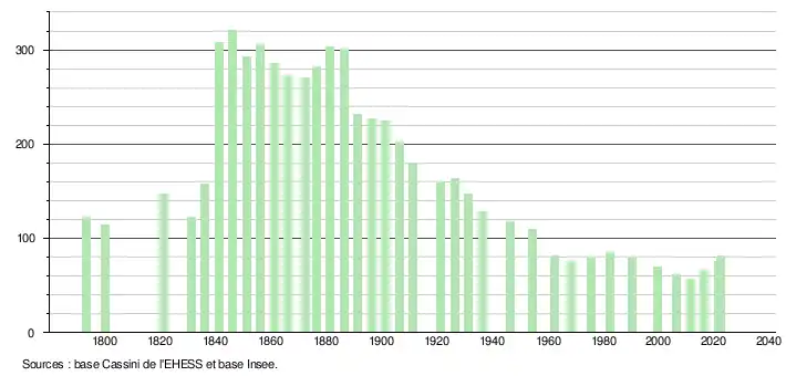 L'évolution du nombre d'habitants est connue à travers les recensements de la population effectués dans la commune depuis 1793. Pour les communes de moins de 10 000 habitants, une enquête de recensement portant sur toute la population est réalisée tous les cinq ans, les populations de référence des années intermédiaires étant quant à elles estimées par interpolation ou extrapolation[41]. Pour la commune, le premier recensement exhaustif entrant dans le cadre du nouveau dispositif a été réalisé en 2006[42].