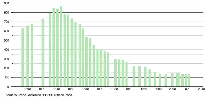 L'évolution du nombre d'habitants est connue à travers les recensements de la population effectués dans la commune depuis 1793. Pour les communes de moins de 10 000 habitants, une enquête de recensement portant sur toute la population est réalisée tous les cinq ans, les populations de référence des années intermédiaires étant quant à elles estimées par interpolation ou extrapolation[19]. Pour la commune, le premier recensement exhaustif entrant dans le cadre du nouveau dispositif a été réalisé en 2008[20].