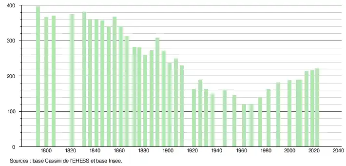 L'évolution du nombre d'habitants est connue à travers les recensements de la population effectués dans la commune depuis 1793. Pour les communes de moins de 10 000 habitants, une enquête de recensement portant sur toute la population est réalisée tous les cinq ans, les populations de référence des années intermédiaires étant quant à elles estimées par interpolation ou extrapolation[23]. Pour la commune, le premier recensement exhaustif entrant dans le cadre du nouveau dispositif a été réalisé en 2008[24].