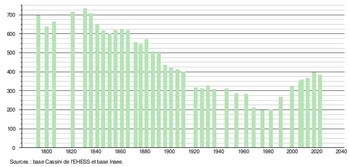 - ↑ Fiches Insee - Populations de référence de la commune pour les années 2006, 2007, 2008, 2009, 2010, 2011, 2012, 2013, 2014, 2015, 2016, 2017, 2018, 2019, 2020, 2021 et 2022.