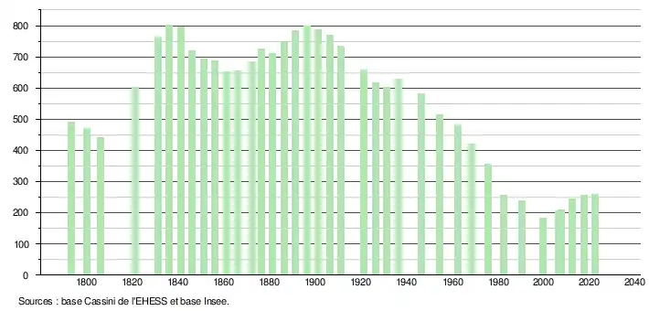 L'évolution du nombre d'habitants est connue à travers les recensements de la population effectués dans la commune depuis 1793. Pour les communes de moins de 10 000 habitants, une enquête de recensement portant sur toute la population est réalisée tous les cinq ans, les populations de référence des années intermédiaires étant quant à elles estimées par interpolation ou extrapolation[18]. Pour la commune, le premier recensement exhaustif entrant dans le cadre du nouveau dispositif a été réalisé en 2007[19].
